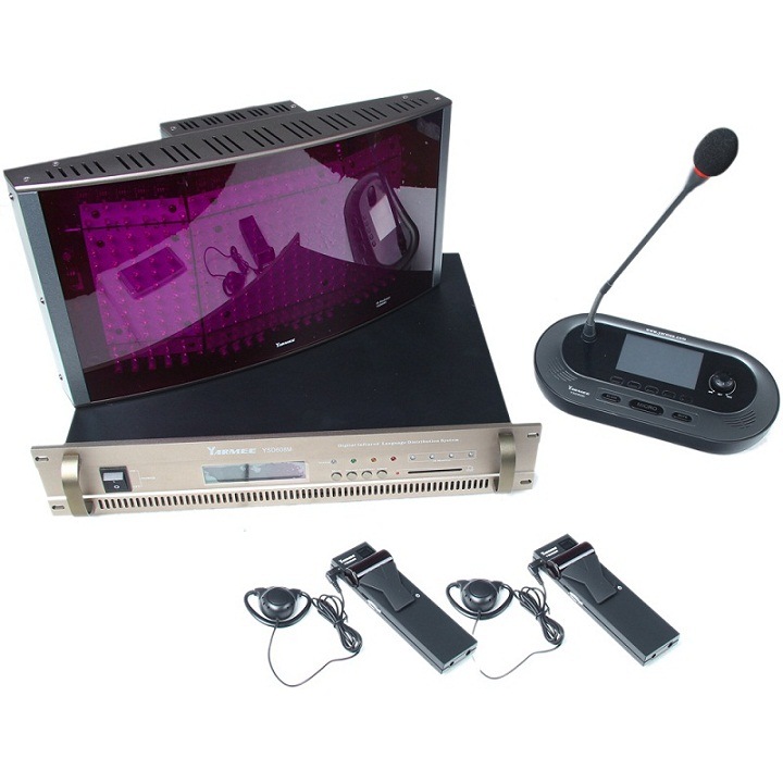 Система синхронного перевода состоит из нескольких компонентов - пульты переводчиков, наушники и микрофоны для синхронистов, излучатели сигнала, персональные приемники, индивидуальные наушники для слушателей, кабины переводчиков.
